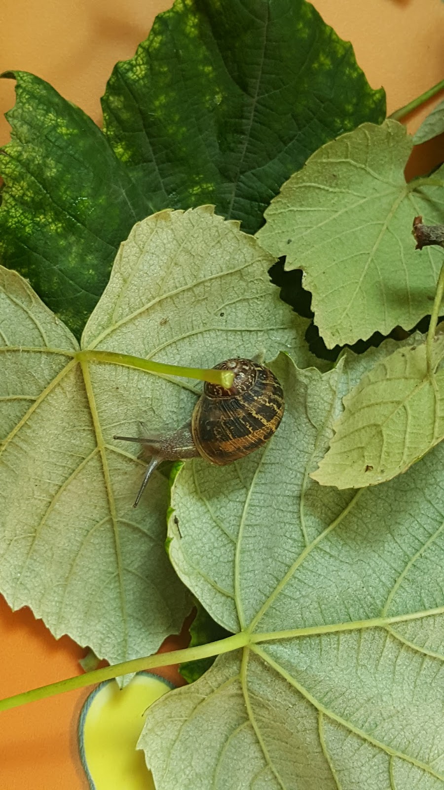 CUANDO ESTÁBAMOS SOLTANDO LAS UVAS HEMOS DESCUBIERTO UN "INTRUSO", UN PEQUEÑO CARACOL QUE SE HA ESCAPADO Y ESTABA SUBIENDO POR LA SILLA DE RAQUEL. LO HEMOS METIDO EN UN BOTE CON AGUJERITOS EN LA TAPA PARA QUE PUDIERA RESPIRAR Y UNAS HOJAS DE PARRA PARA QUE TUVIERA PARA COMER.